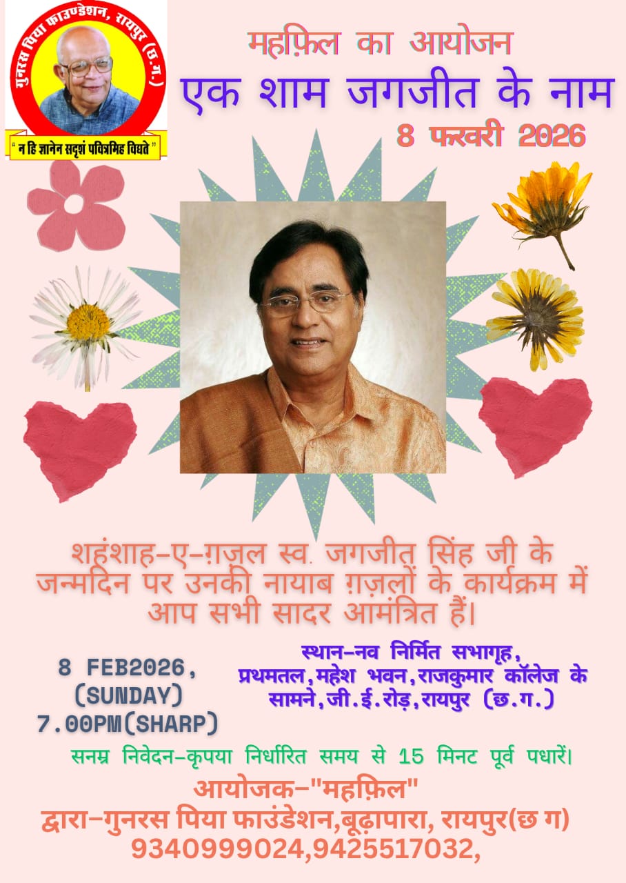 शहंशाह ए ग़ज़ल स्व जगजीत सिंह जी के जन्मदिन पर आगामी 8 फरवरी (रविवार) को एक शाम –”जगजीत जी के नाम ” का आयोजन महफ़िल द्वारा किया जा रहा है। इस कार्यक्रम में जगजीत सिंह जी की नायब ग़ज़लों की प्रस्तुति होगी। दर्जेदार कार्यक्रमों से पूरे शहर में जानी जाने वाली संस्था गुनरस पिया फाउन्डेशन द्वारा राजकुमार कॉलेज के सामने, जी ई रोड़, रायपुर स्थित –महेश भवन के वातानुकूलित सभागार, में शाम 6:30 बजे से आयोजित इस कार्यक्रम में श्री दीपक गुणवंत व्यास के निर्देशन में डॉ जावेद अली, अनुराग शुक्ल, गिरिश मिश्र, गौतम घाटगे, अतीक रहमान, रचना चांडक, अराधना बैद, डी लता एवं वैशाली जोशी जगजीत सिंह एवं चित्रा सिंह जी की ग़ज़लों को प्रस्तुत करेंगे।कलाकारों के साथ किबोर्ड पर श्री सत्या मुदलियार जी, तबले पर श्री अनुराग सिंग जी, गिटार पर अतीक रहमान एवं आदित्य सिंग तथा पैड पर श्री नागेश साहू जी साथ देंगे। कार्यक्रम की सूत्रधार होंगी जानीमानी उद्घोषिका एवं साहित्यिक श्रीमती शुभ्रा ठाकुर जी। संस्था के निदेशक दीपक व्यास ने कहा कि इस कार्यक्रम में श्रोताओं को निशुल्क प्रवेश दिया जाएगा, उन्होंने सभी संगीत प्रेमियों को इस कार्यक्रम में आमंत्रित किया है।